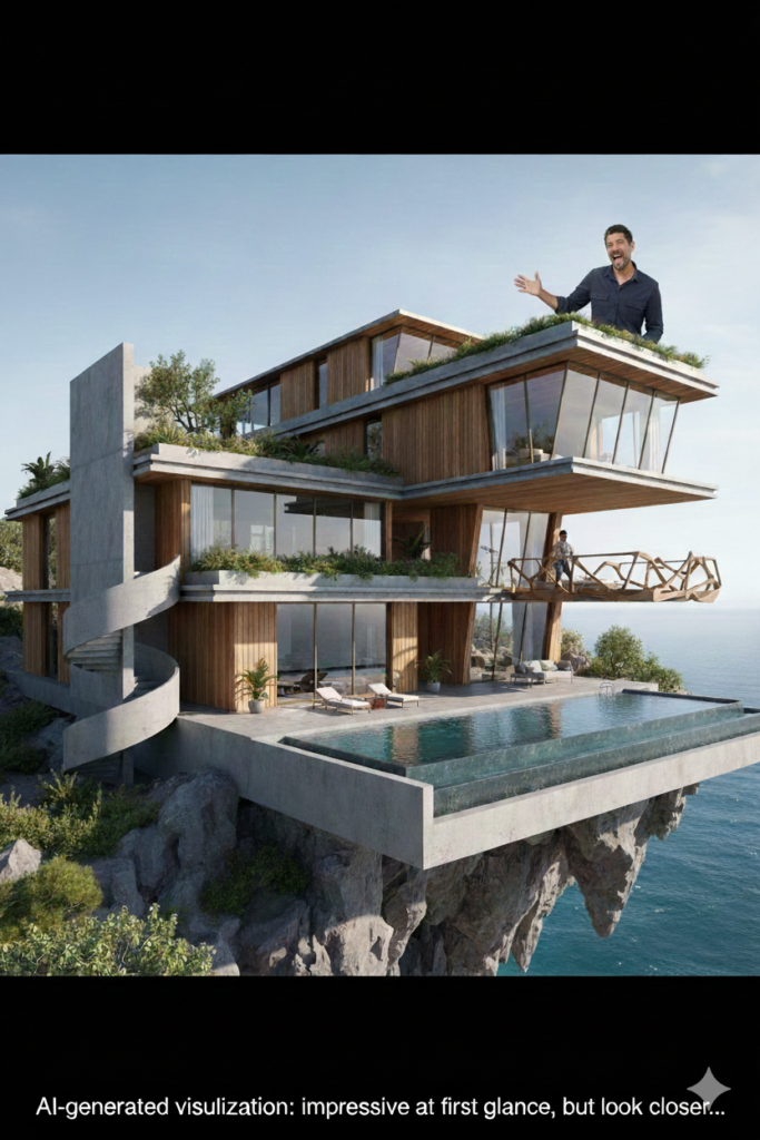 Let me be honest: AI’s current usefulness in architecture is pretty limited. The main application I’m seeing is in early stage visualizations. You can feed an AI tool some parameters and get back images that look like architectural renderings. Sometimes they’re impressive. Sometimes they’re useful for helping a client visualize a concept before we’ve invested hours in proper drawings. And sometimes they’re absolutely bizarre, with windows that defy physics and staircases that lead nowhere.